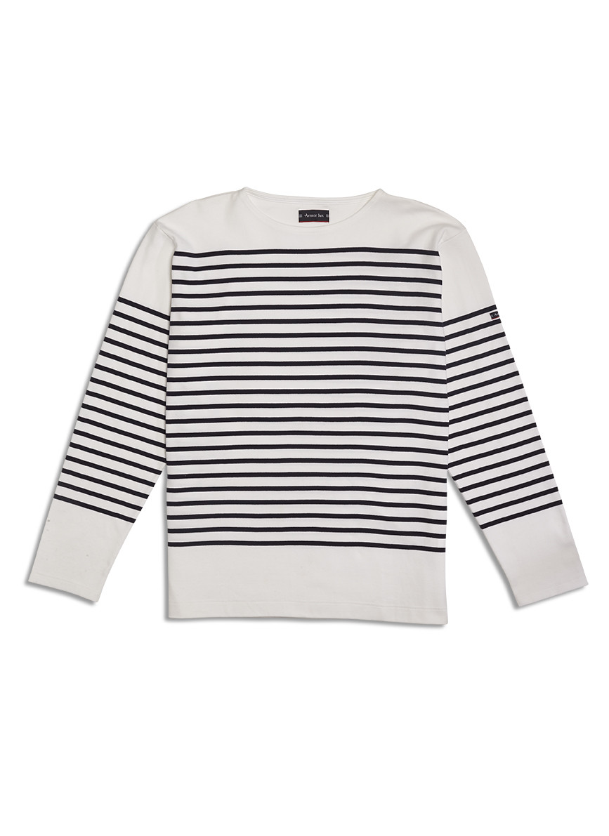 Marinière manches longues col bateau. Inspirée de l’uniforme de la Marine Nationale Française. Étiquette Armor Lux sur la manche gauche.