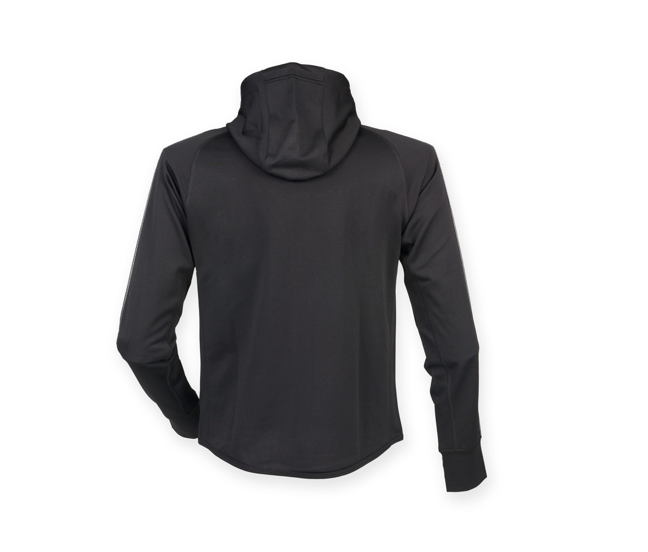 Sweat capuche avec bandes réfléchissantes. Manches raglan. Coupe près du corps. Poche intérieure MP3. 2 poches zippées latérales.
