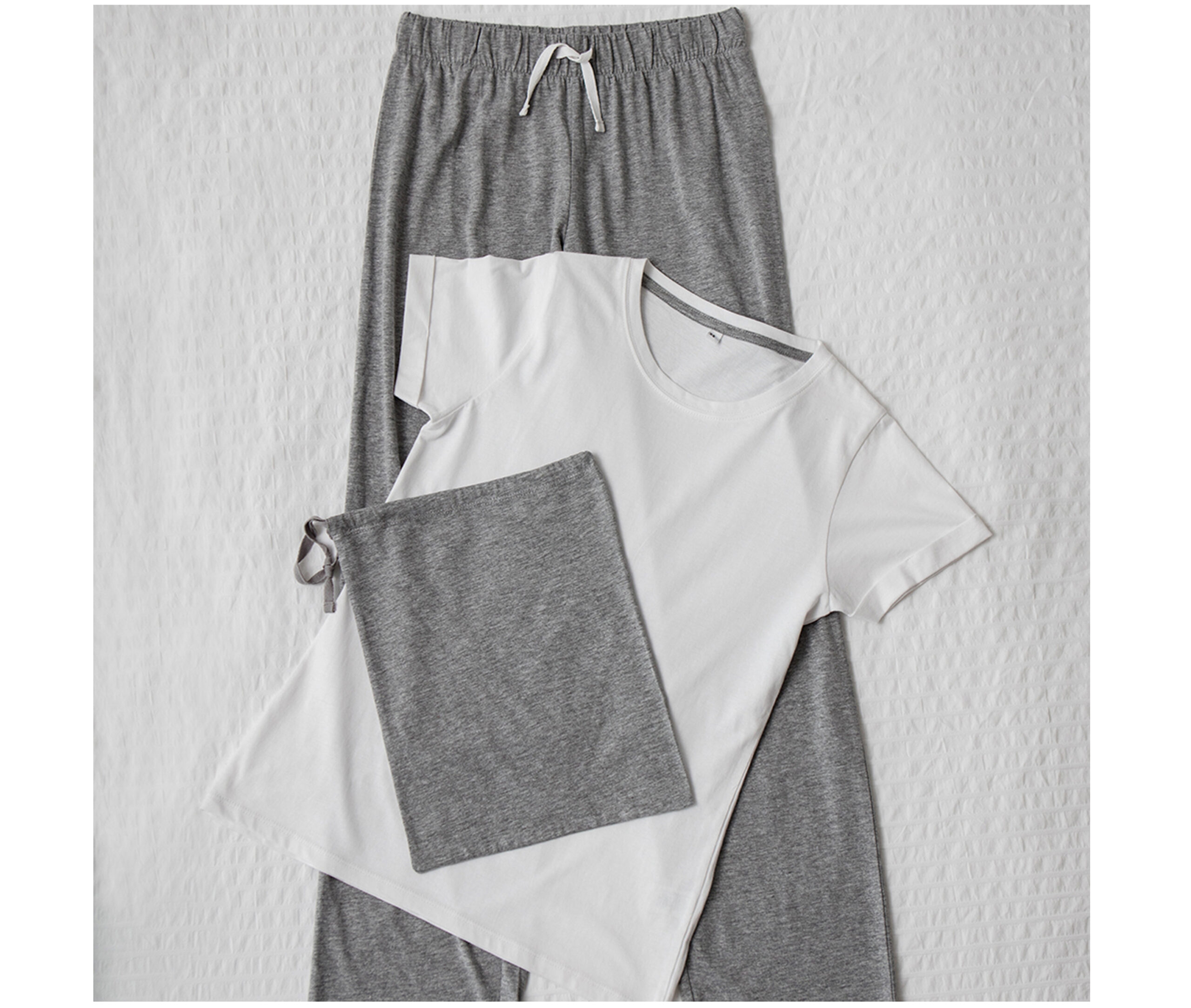 Ensemble : t-shirt blanc et pantalon contrasté. Doux et léger. Vendu dans un sac contrasté avec cordon.