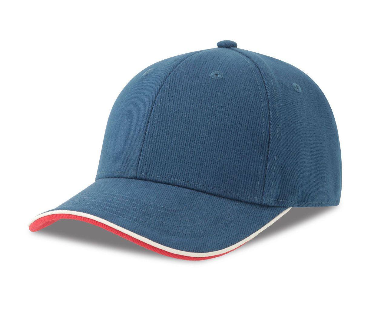 6 panneaux. Visière précourbée et contrastée en-dessous. Liseré sur visière et patte de fermeture. Panneau avant renforcé. Œillets surpiqués. Bandeau en coton. Fermeture par boucle métal. Tou