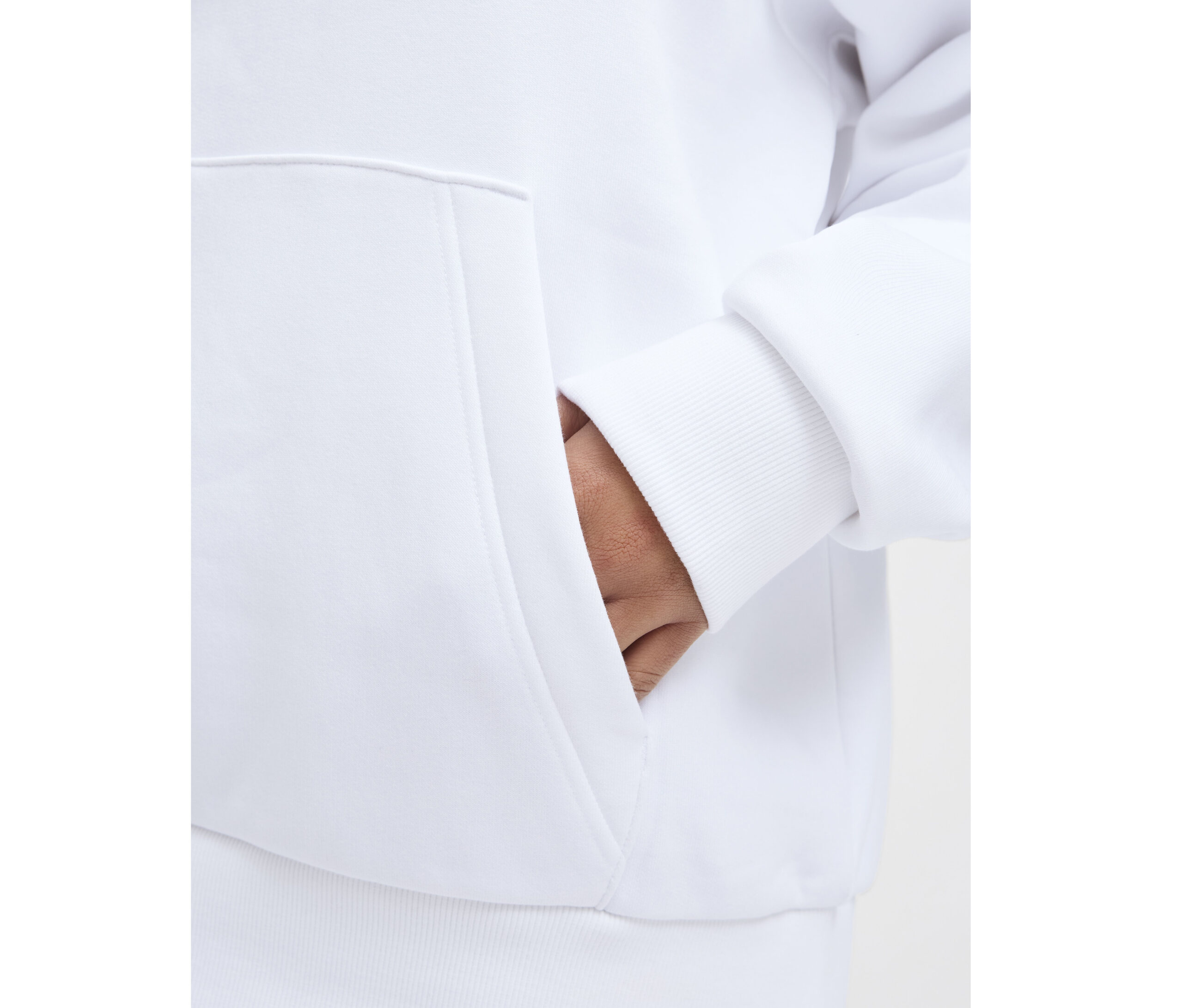 Intérieur brossé. Bords côte de 7cm à la taille et aux manches. Capuche avec cordon de serrage avec embouts en métal. Coupe ample.