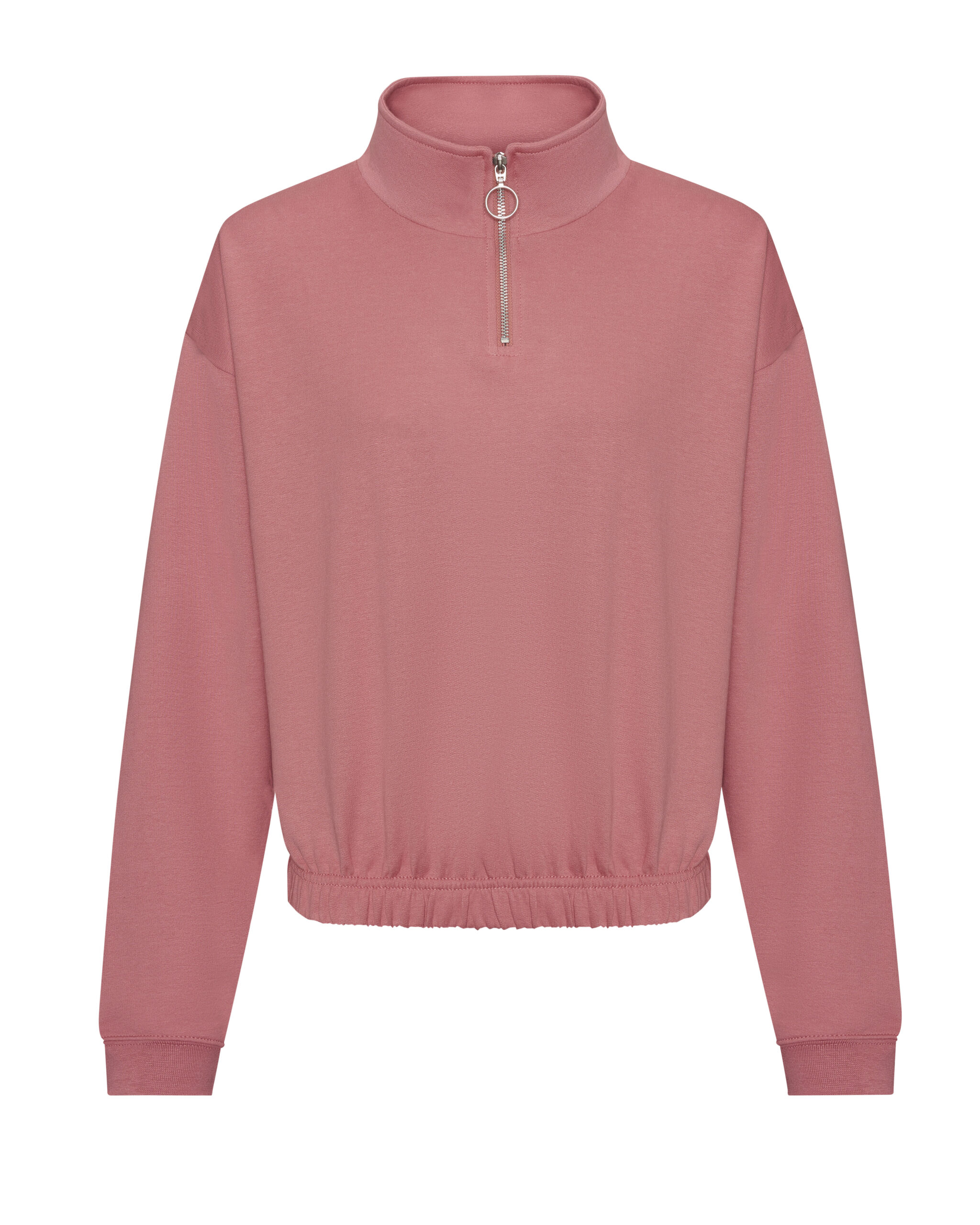 Coupe féminine classique. Col cheminée (1/4 zip). Intérieur brossé. Taille élastiquée. Poignets en bords côte. Étiquette détachable.